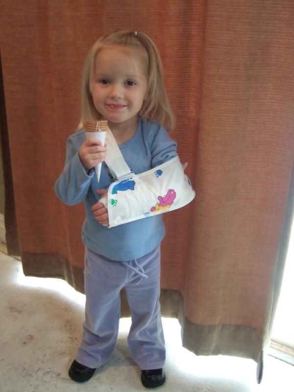 Ice cream after breaking her arm falling out of the apple tree.