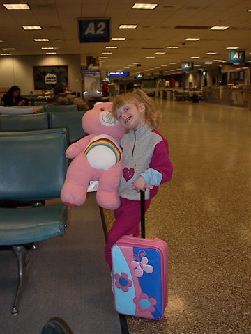 Megan at Salt Lake Airport. Ready to go, but doesn't really believe we are going on an airplane |