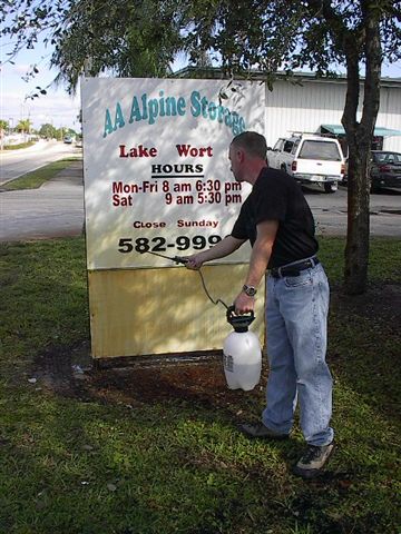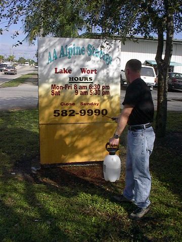 The water in florida has a lot a metal or copper or somthing in it which makes everything the sprinkler touches turn rusty. So you go around with a spray and just like magic it dissapeares |