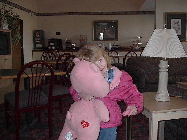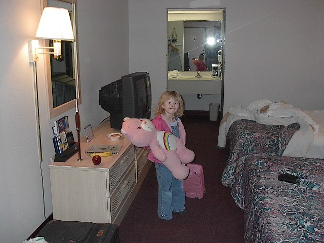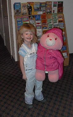 Megs and the bear. It is morning and we are getting ready to leave. The sun is not up yet and it is raining out side. Megan got wet, but luckily the bear didn't. |
