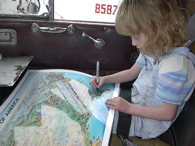 Megan mapped the way all the way home. Each day she kept the marker drawn on the road along the rout we took. I think it really helped her know where we were and get a better learning experiance out of the trip |